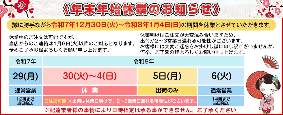 平素より「問屋よかろうもん」をご利用頂き誠にありがとうございます。 年末年始休業期間につきまして下記の通りご案内いたします。 誠に勝手ながら、下記期間を休業日