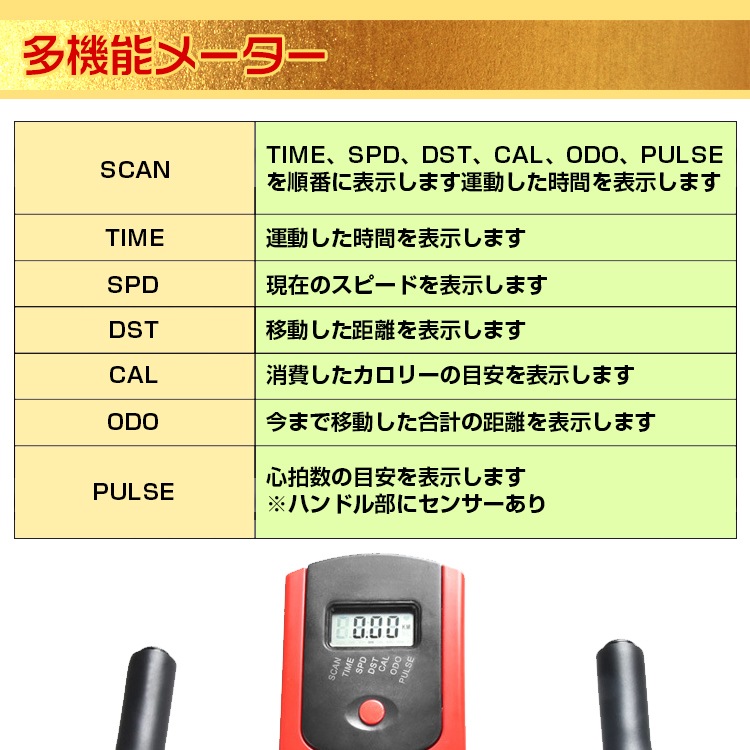 ■時間、速度、距離、カロリーなどを計測できるメーター