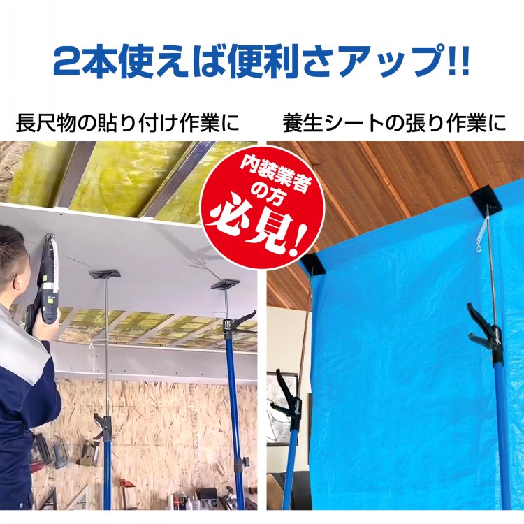 ■2本使用すると長尺物の貼り付け作業や養生シートの張り作業がラクになります。