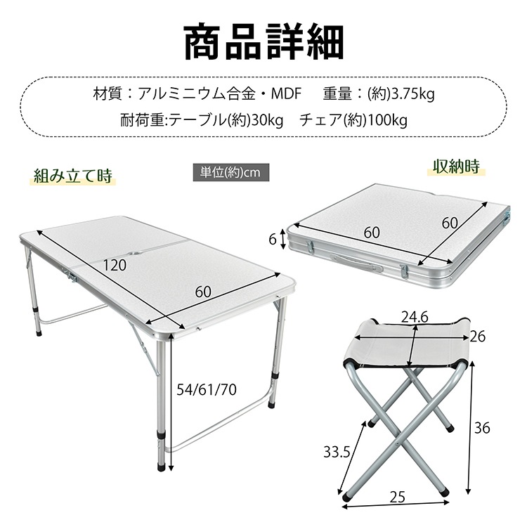 【耐荷重】:テーブル(約)30kg/チェア(約)100kg