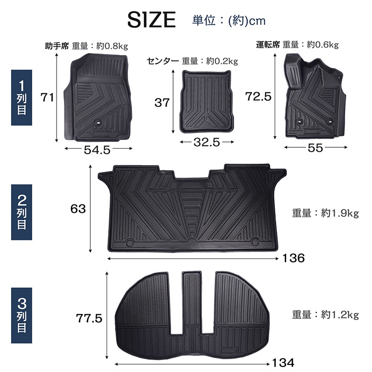 【サイズ】:(約)助手席/54.5×71cm・センター/32.5×37cm・運転席/55×72.5cm・2列目/136×63cm・3列目/134×77.5cm
