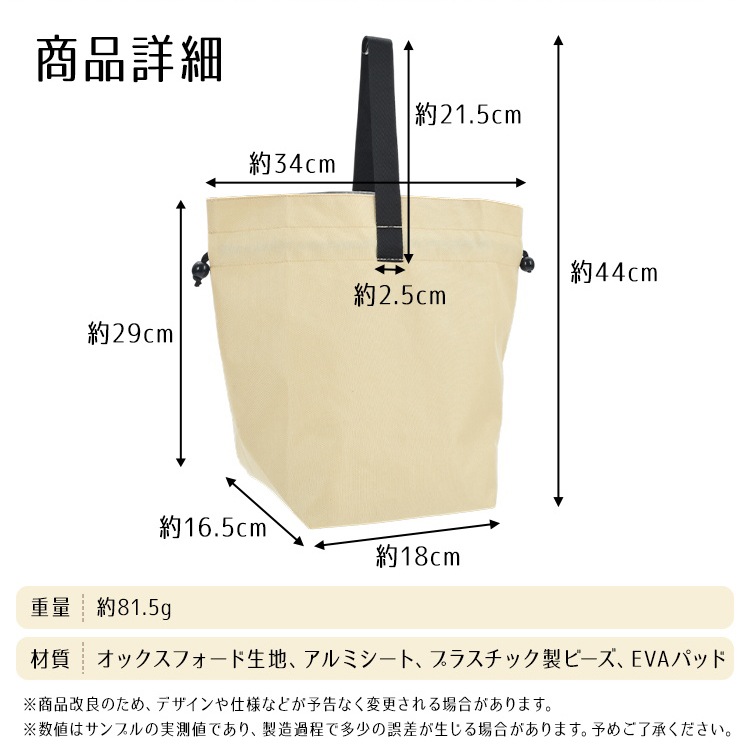【材質】:オックスフォード生地、アルミシート、プラスチック製ビーズ、EVAパッド