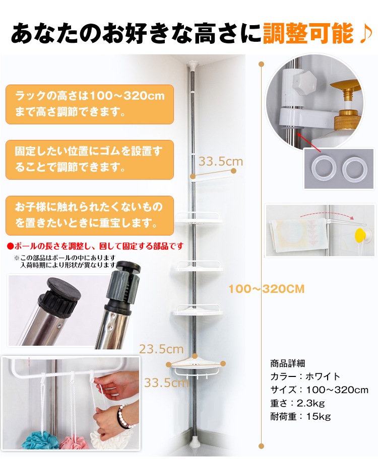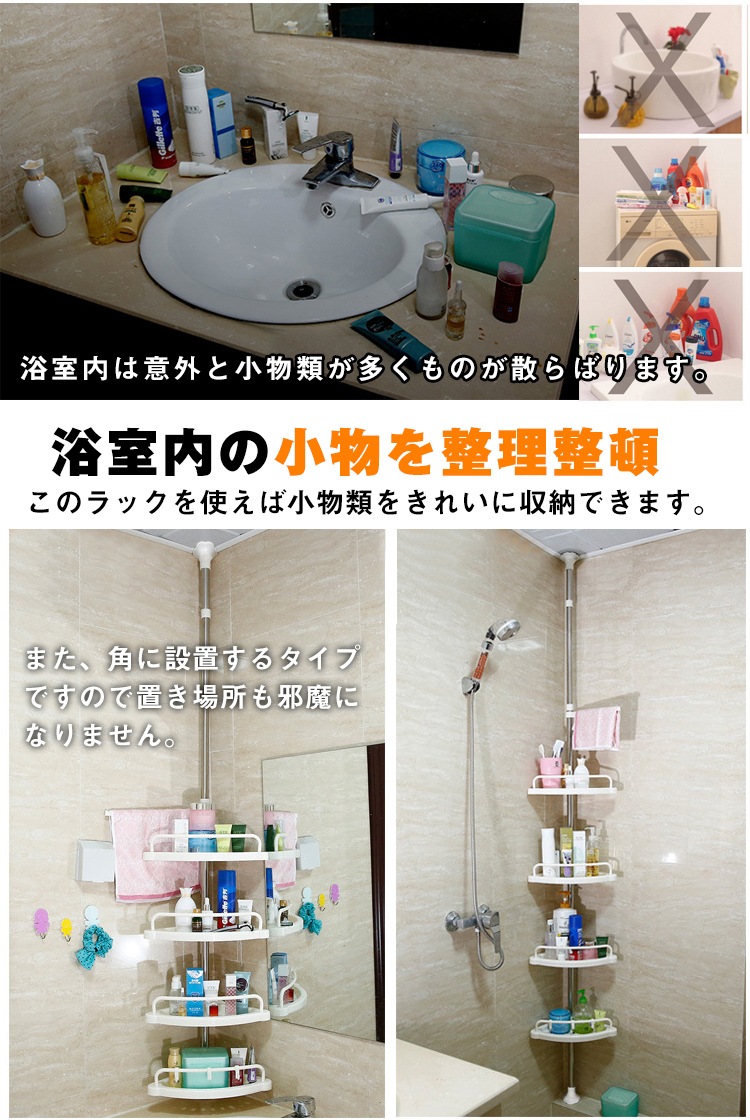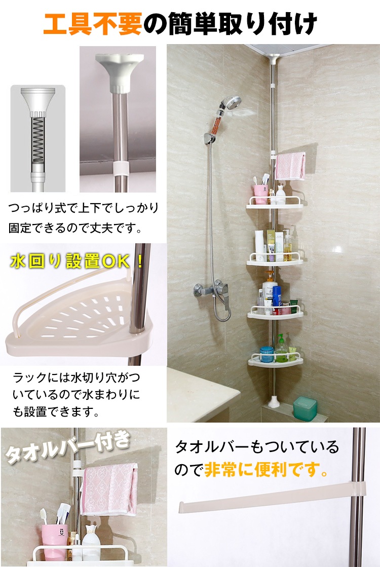【商品内容】:浴室内の小物を整理整頓♪4段式つっぱりコーナーラック zk083