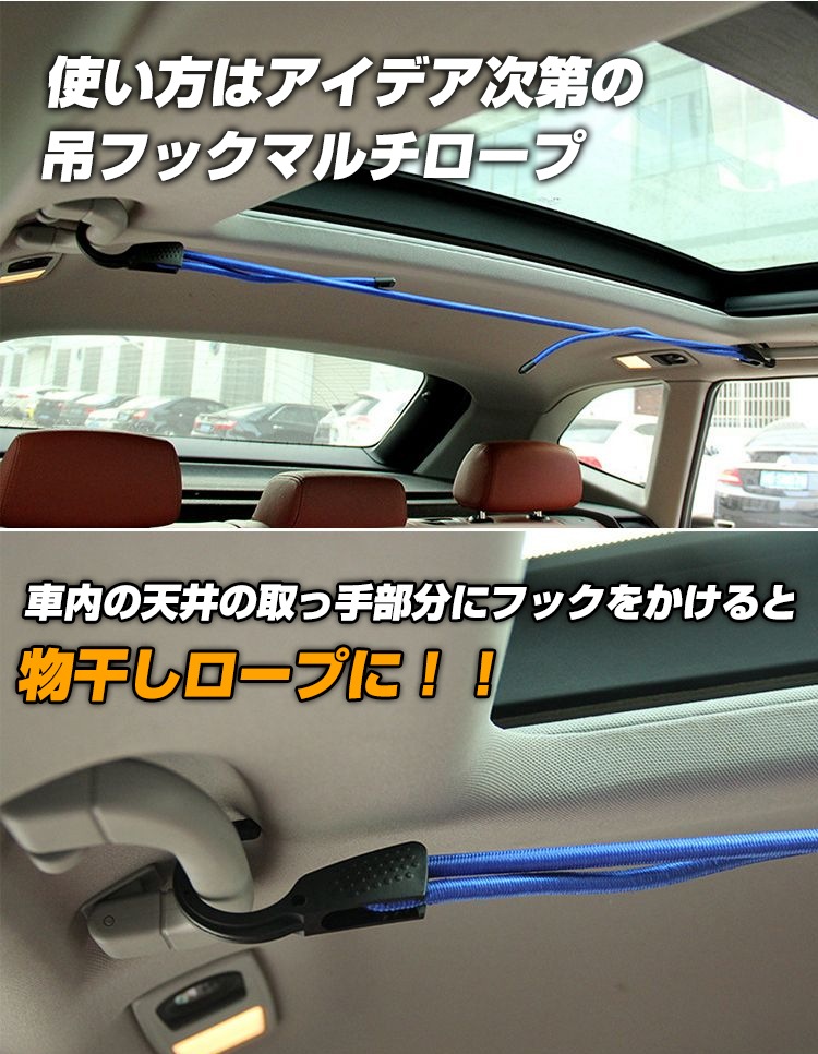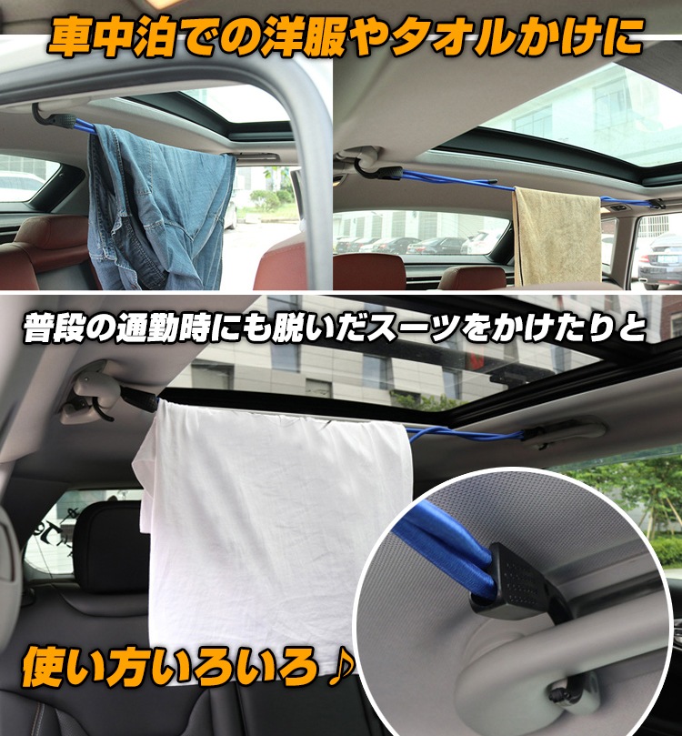 ■車内の天井の取っ手部分にフックをかけると物干しロープになります