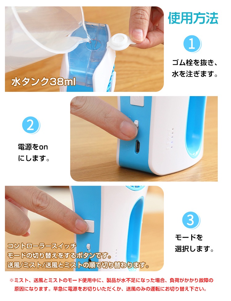 ■ミスト噴射機能のついた携帯型の扇風機!水と風の力で涼しく快適♪