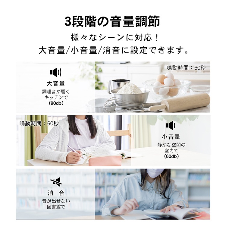 【アラーム音量】:大(90db)/小(60db)/消音