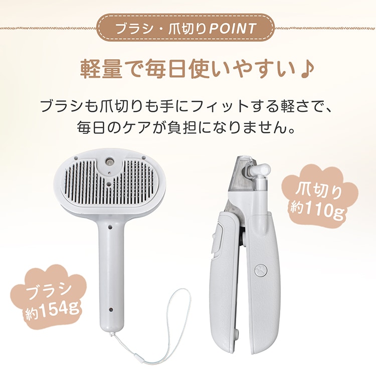 ■犬猫どちらも使えるペットブラシと爪切りがセットになった商品です。